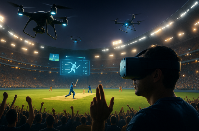 Along with VR, AI-enhanced broadcasts will be the norm. Thanks to 6G networks and smart cameras, you can expect 16K-quality streams with zero lag. Commentaries will be auto-translated into many languages in real time – one crowd cheering in Hindi, another hearing their favorite English or Spanish commentator, all simultaneously. LED billboards around the ground will show personalized sponsor messages or stats based on your digital profile, so every fan sees content that speaks to them. Meanwhile, ball-tracking and AI predictions will be overlaid on screens instantly, showing an on-field LBW or hot-spot decision before even TV replays.
